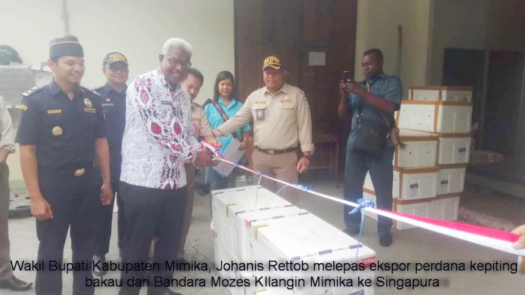 Timika Tual News – Wakil Bupati Kabupaten Mimika Papua, Johanis Rettob, secara resmi kamis ( 28/11/2019 ) di Bandara Mozes Kilangin Timika melepas 128 kilo kepiting bakau yang diekspor UD Putri Desi ke Singapura.