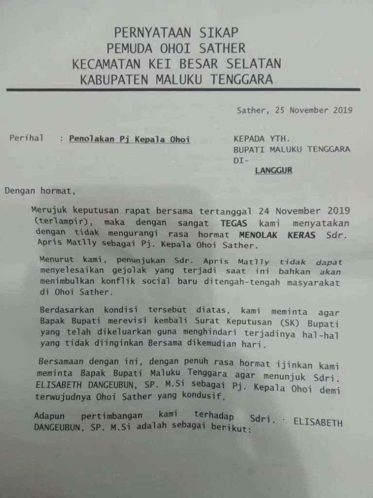 “ dengan penuh rasa hormat ijinkan kami meminta Bupati Malra menunjuk sdri. Elisabeth Dangeubun, SP.M.Si sebagai Pj. Kepala Ohoi Sather demi terwujud kondisi Ohoi yang kondusif “ Pintah para pemuda.