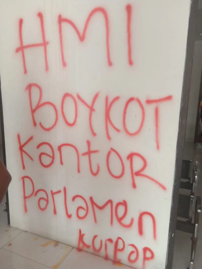 Pantauan tualnews.com adu mulut yang terjadi, akibat para pendemo melampiaskan kekecewaanya dengan cara mencoret dinding depan Kantor DPRD Kota Tual dengan tulisan “ HMI Boykot Kantor Parlemen “.