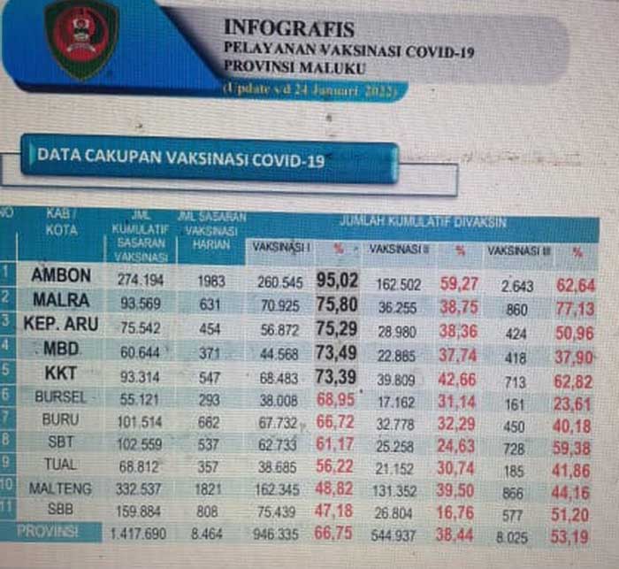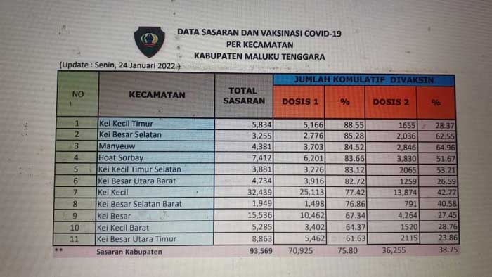 Sementara itu berdasarkan update data vaksinasi covid-19 Provinsi Maluku, tertanggal 24 Januari 2022, peringkat lima besar vaksinasi 11 Kab / Kota di Maluku yakni Kota Ambon, Kabupaten Maluku Tenggara, Kep. Aru, MBD dan KKT. Kota Tual berada di peringkat sembilan. ( TN )