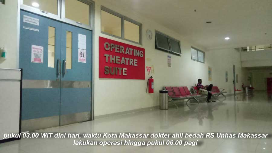 “ pada pukul 03.00 WIT dini hari, waktu Kota Makassar dokter ahli bedah RS Unhas Makassar lakukan operasi hingga pukul 06.00 pagi, “ terangnya.