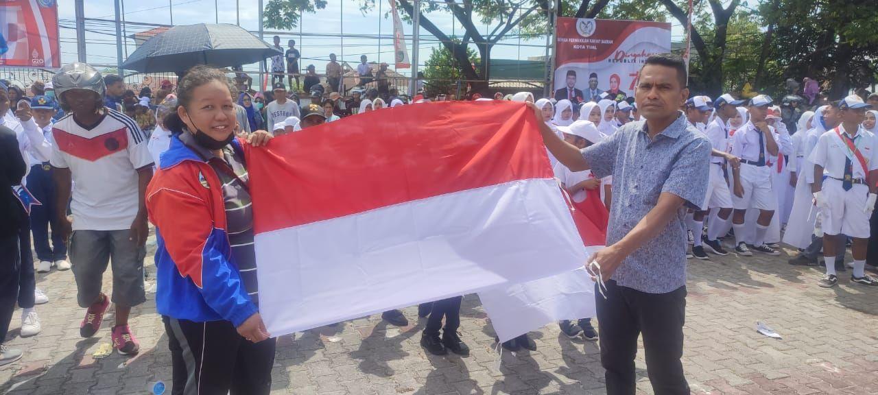 Walikota Tual, Adam Rahayaab, S.Ag, M.Si menyerahkan secara simbolis bendera merah putih kepada perwakilan masyarakat Kota Tual dan sekaligus melepas peserta lomba gerak jalan dengan iringan drum band dari SMP Negeri 5 Kota Tual.