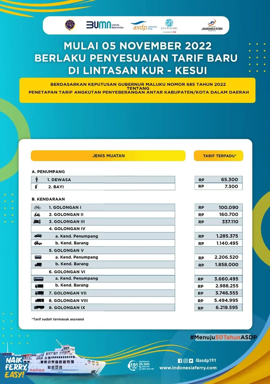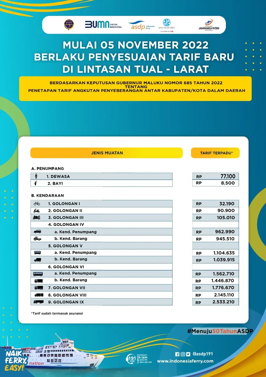Tual News – Masyarakat yang akan menyeberang menggunakan jasa kapal ferry dari Tual menuju Kei Besar dan Dobo, Kabupaten Kepulauan Aru serta Tual – Kaimana – Lobo, diinformasikan kalau mulai sabtu ( 05 /11/2022), ASDP memberlakukan kenaikan tarif pelabuhan penyeberangan.