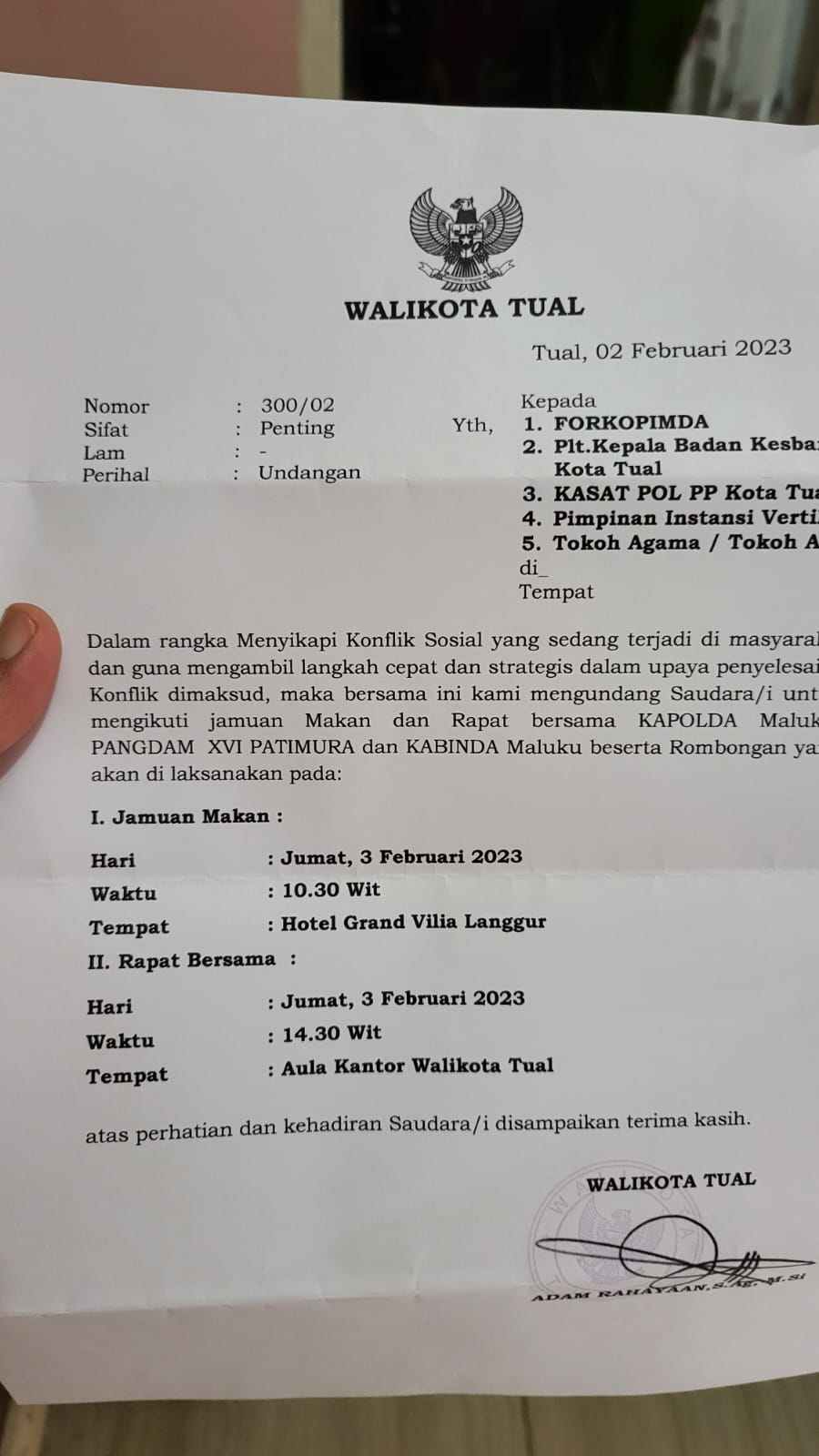 Sesuai jadwal yang dikeluarkan Walikota Tual, Kapolda Maluku dan Kabinda Maluku akan dijamu makan bersama seluruh komponen masyarakat di Villia Hotel Langggur, jumat ( 3 /2/2023) pukul 10.00 WIT, kemudian dilanjutkan rapat bersama di Aula Kantor Walikota Tual pukul 14.30 WIT.
