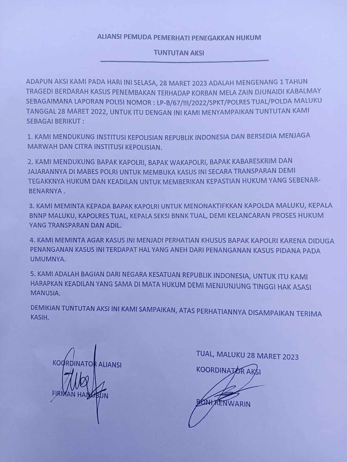 Aksi bisu yang dipimpin koordinator aksi, Roni Renwarin dan koordinator Aliansi Pemuda, Firman Hanubun membentangkan spanduk dan pamflet meminta Kapolri, Sigit Listyo Prabowo, menonaktifkan jabatan Kapolda Maluku, Kapolres Tual dan Kepala Seksi Penindakan BNNK Tual, demi kelancaran proses hukum kasus penembakan yang transparan dan adil.