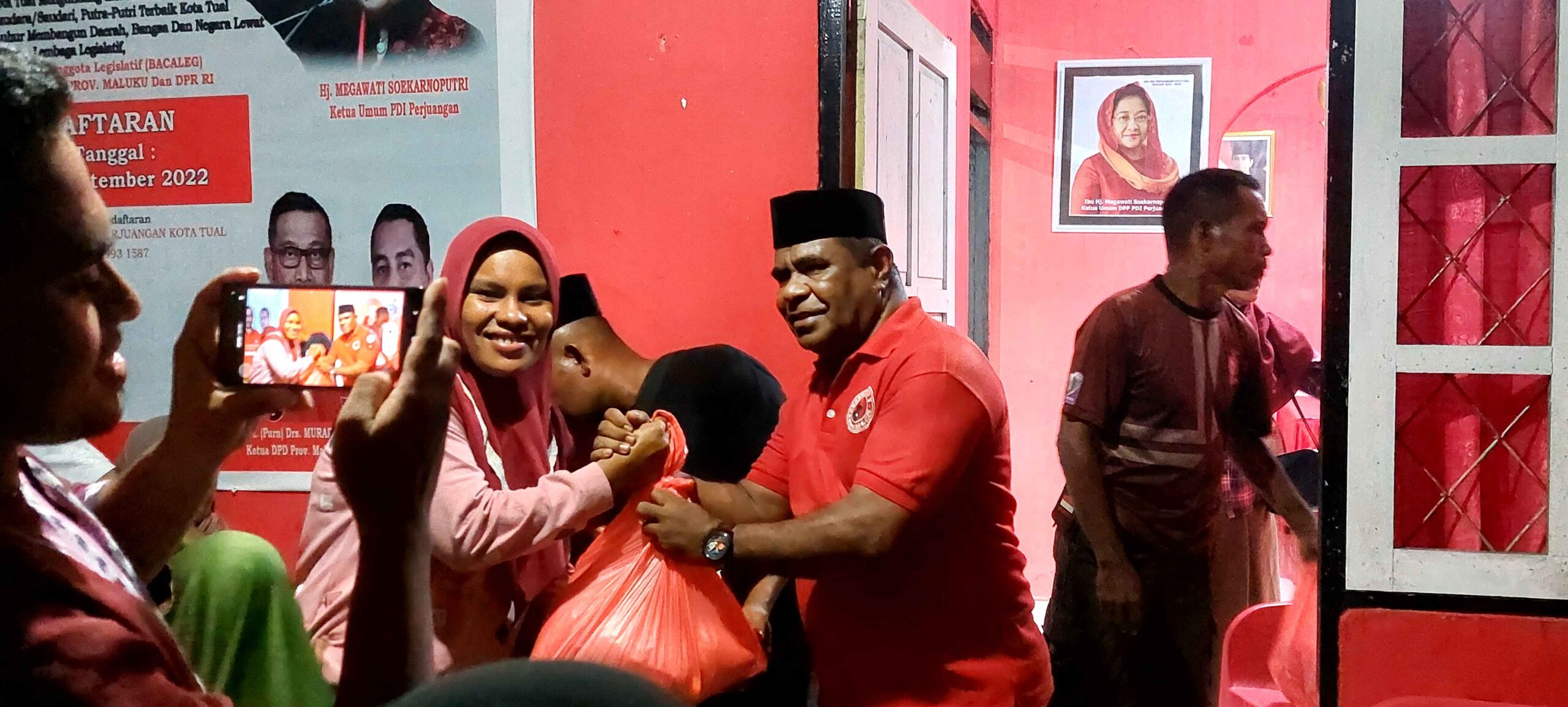 Tual News – Anggota Komisi VII DPR RI, Mercy Chriesty Barends, S.T dalam kegiatan Safari Ramadhan di Kantor DPC PDI – Perjuangan Kota Tual, Jumat malam ( 31 /3/2023) pukul 19.30 WIT membagikan seratus paket sembako kepada para Ibu Janda dan mama – mama yang berjualan di pasar selama bulan Puasa Ramadhan.