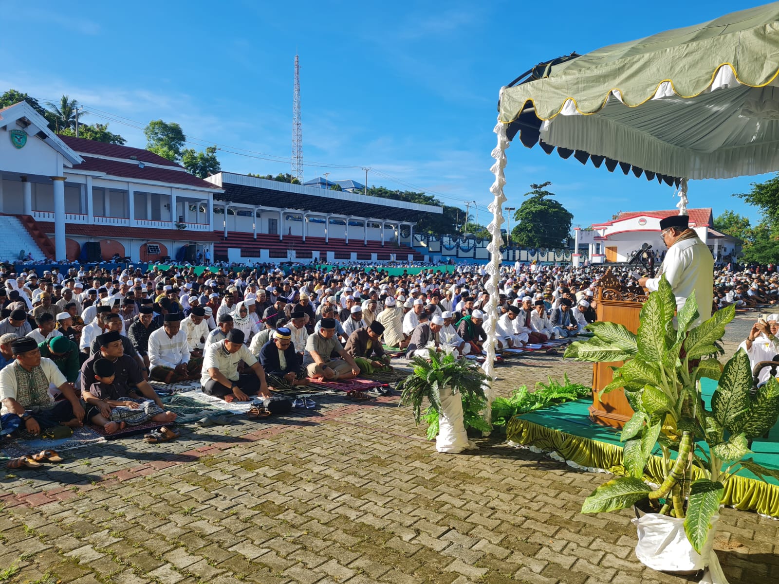 Tual News – Walikota Tual, Adam Rahayaan, S.Ag, M.Si bersama Forkopimda melaksanakan Sholat Idul Fitri 1444/H di lapangan Lodar El Kota Tual, Sabtu pagi ( 22/4/2023).