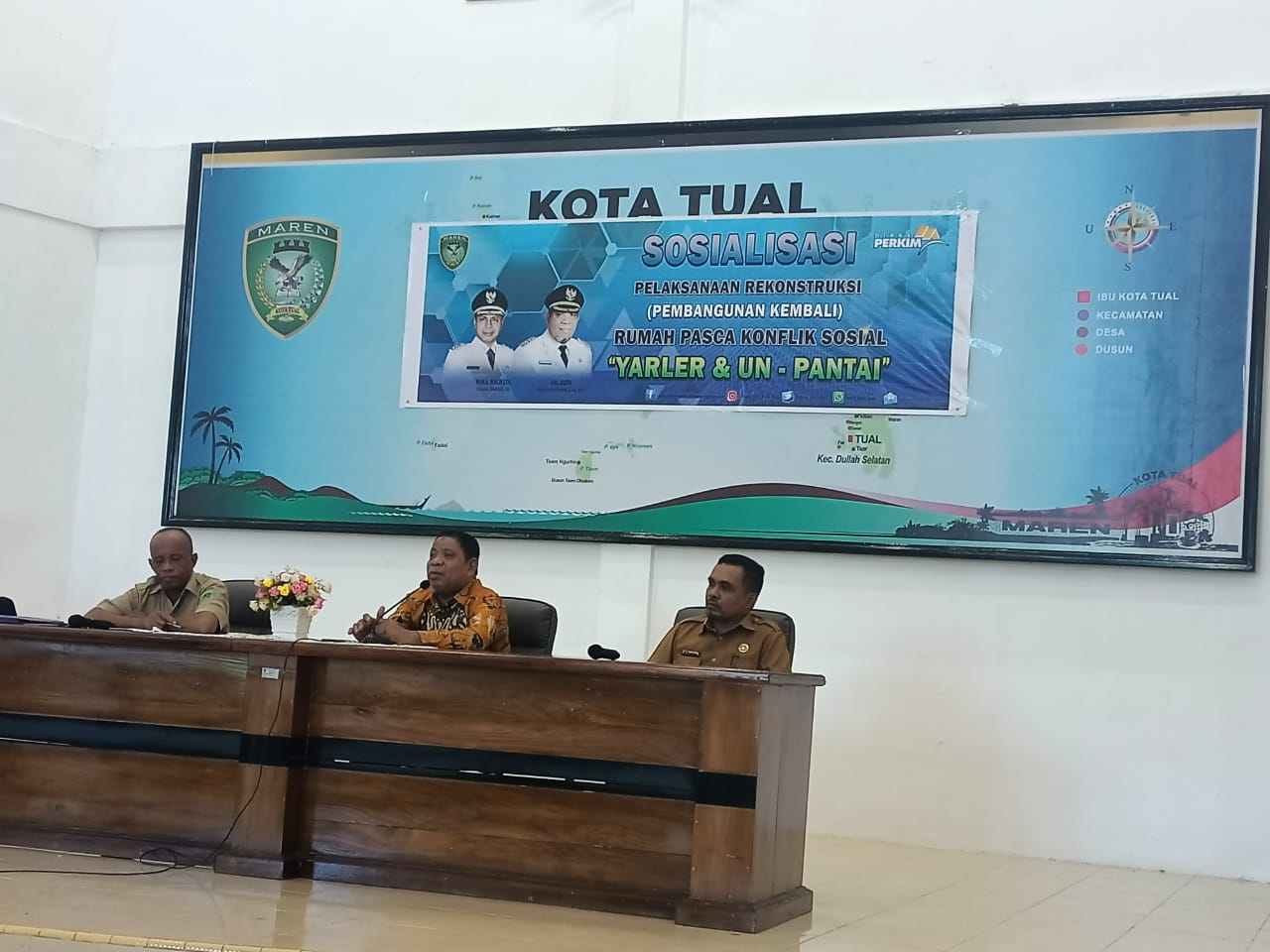 Turut hadir dalam penyerahan bansos buat warga pengungsi Yarler, Kadis Perkim Kota Tual, Usman Rengur.S.T, Mewakili Kepala Dinas Sosial Kota Tual, Dullah Atnangar, Mewakili Kepala Badan Kesbang Pol Kota Tual, Salim H.Nuhuyanan. S.H, Direktur PDAM Tual, Maria Oktovina Far Far, ST dan Camat P. Dullah Selatan.