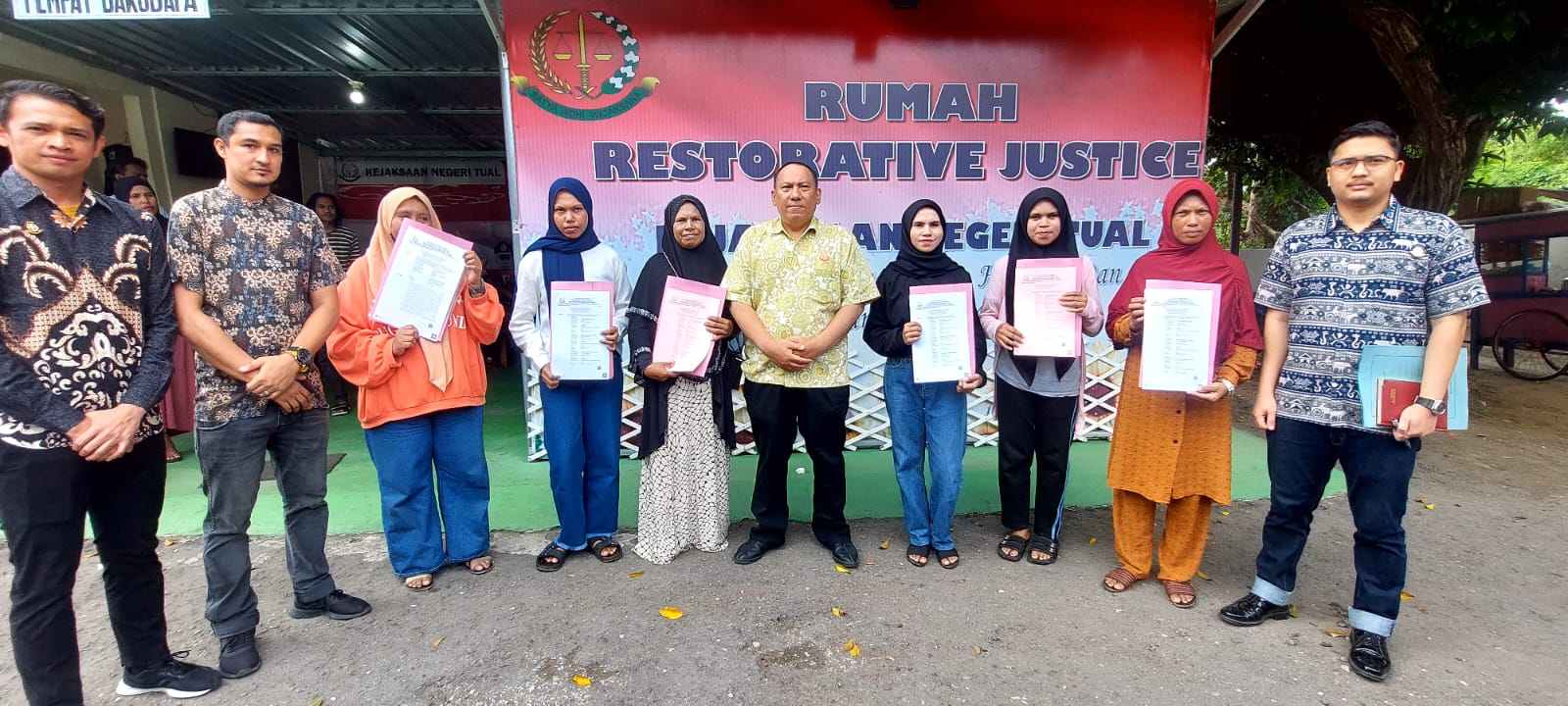 Selanjutnya PLH Kejari Tual menyerahkan berkas SKP2 kepada para tersangka didepan rumah restorative Justice Kejaksaan Negeri Tual, dengan pesan moral agar para tersangka kembali ke masyarakat hidup aman dan damai serta tidak mengulangi lagi perbuatan tindak pidana.
