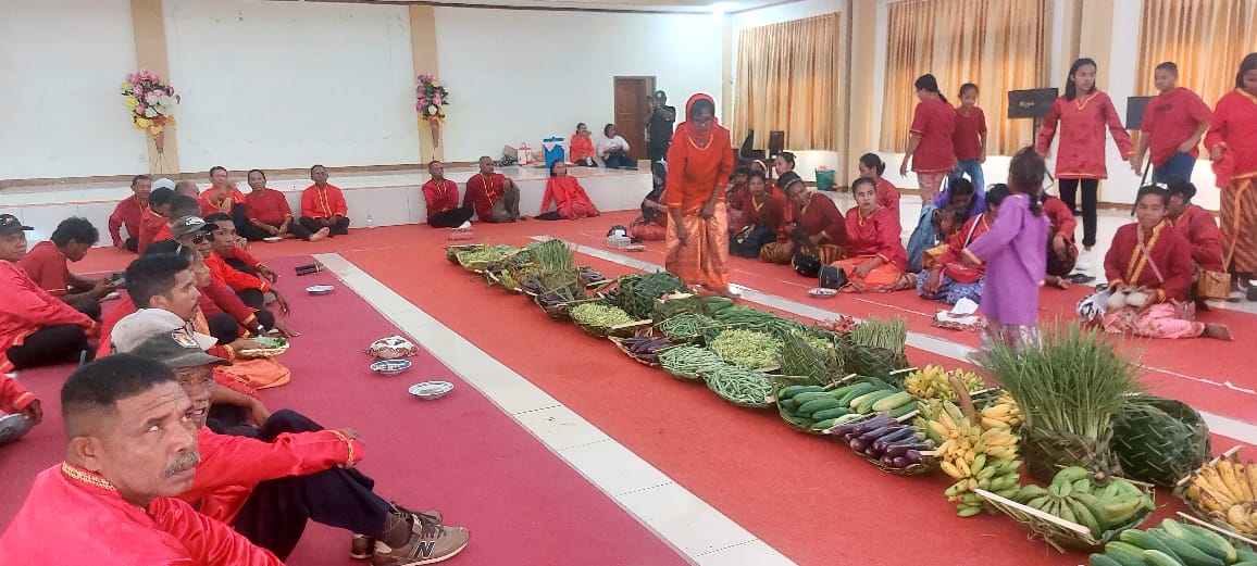 Umat Marfun datang dengan membawah sejumlah bahan makanan tradisional Kei seperti ubi – ubian, sayur sayuran, pisang dan barang lain dijemput umat lingkungan Santo Petrus Canisius Langgur dan panitia penthabisan Gereja Langgur.