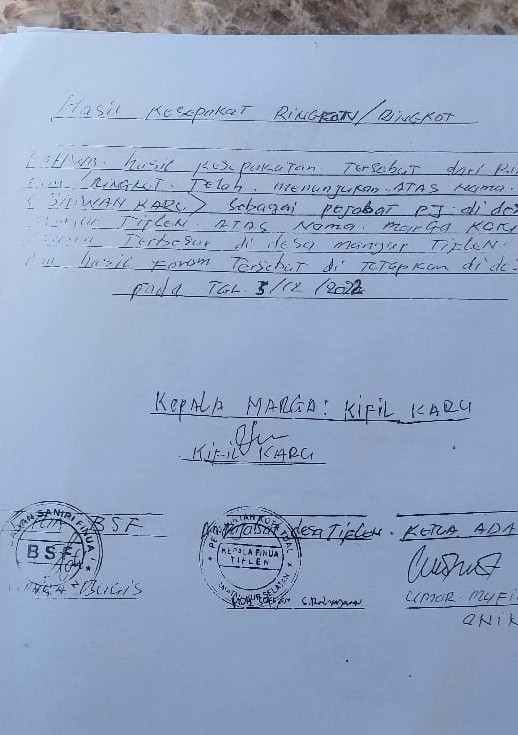 Dikatakan, hasil musyawarah Pimpinan Desa Tiflen, BSF dan Tokoh Adat dan seluruh masyarakat memutuskan kepemilikan kursi Penjabat Finua Tiflen dari Marga Karu.