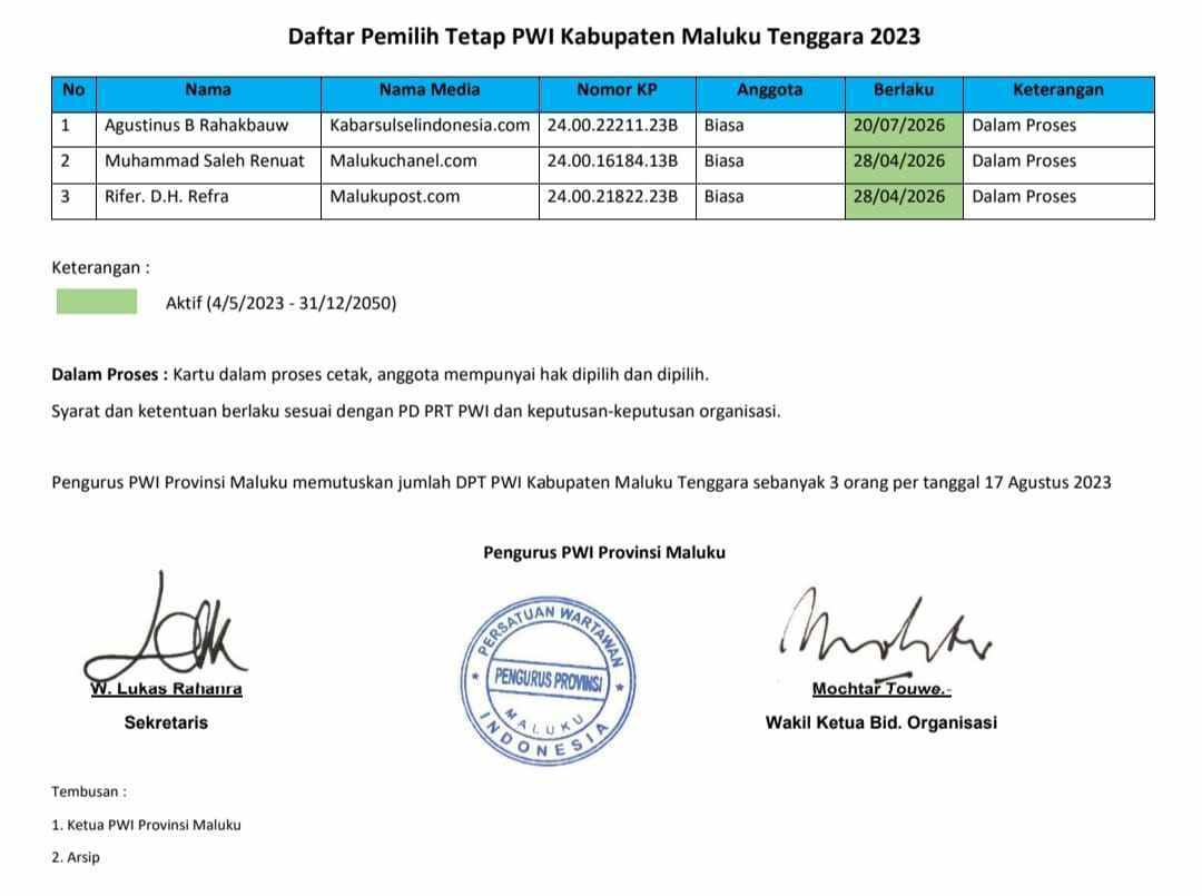 Untuk diketahui, tiga pemilik kartu anggota biasa PWI Malra yang menggunakan hak memilih dan dipilih sesuai AD /ART PWI yakni Agustus Buce Rahakbauw ( Kabarsulsel Indonesia.com), Mohamad Saleh Renuat ( Maluku Chanel.com ) dan River D.H Refra ( Maluku Pos.com).