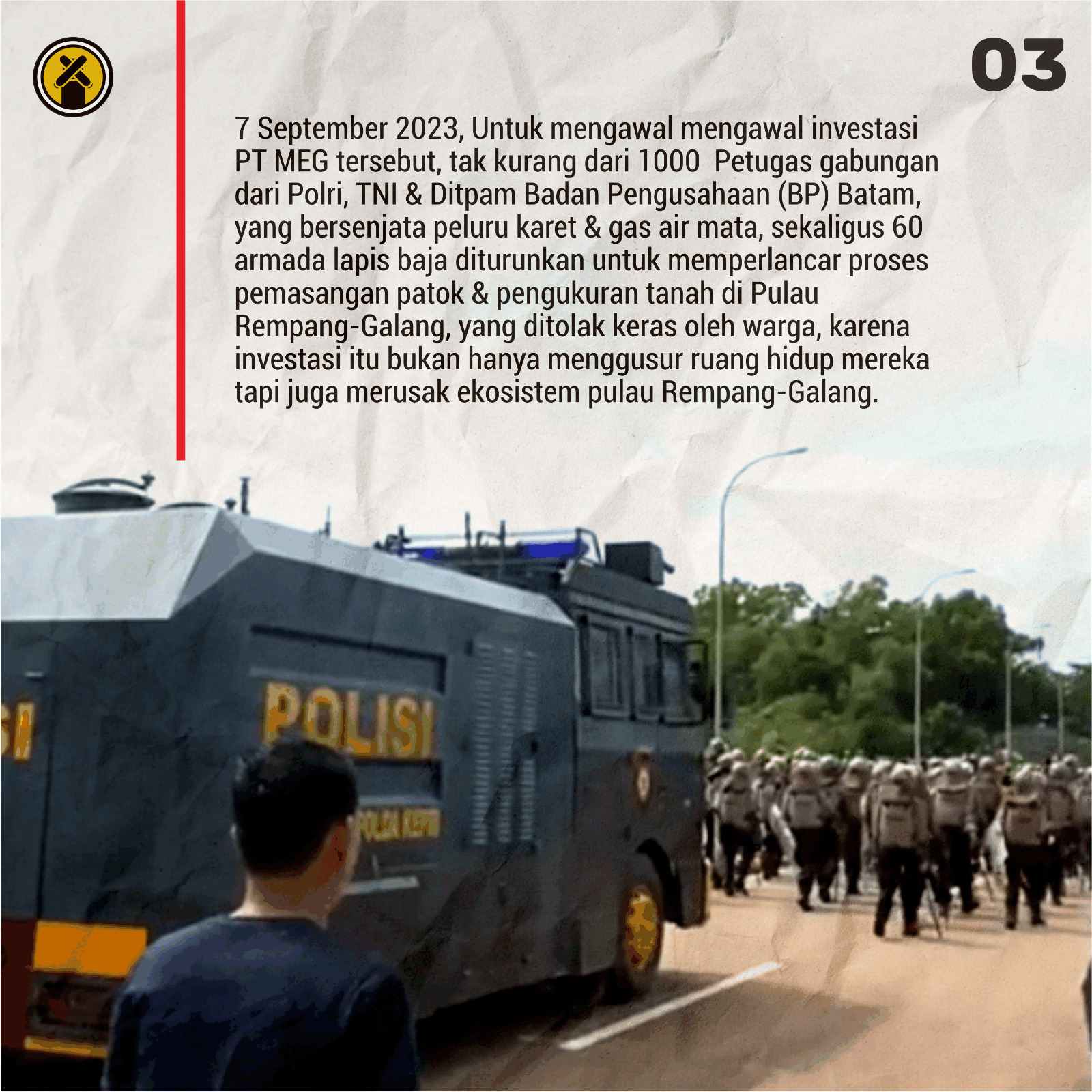 Berdasarkan Rilis Pers Koalisi Masyarakat Sipil Indonesia yang diterima, tualnews.com, Kamis ( 7/9/2023), aparat keamanan TNI Angkatan Laut dan Kepolisian, sebagai alat negara melancarkan ambisi pembangunan Kawasan Rempang Eco-City, dengan menggusur 16 Kampung Melayu Tua yang telah eksis sejak 1834.