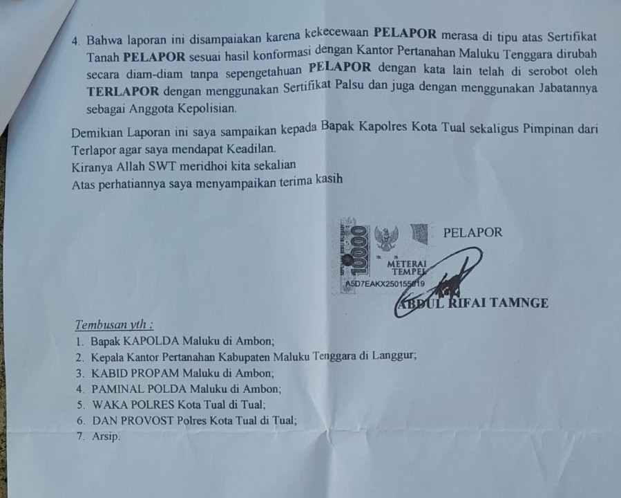 Dia juga membenarkan, terkait hal ini, Paminal Polres Tual dan Polda Maluku sudah mendatangi Kantor BPN Malra mengkonfirmasi persoalan tanah itu yang dilaporkan Abdul Rifai Tamnge.