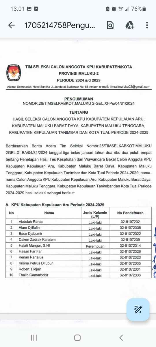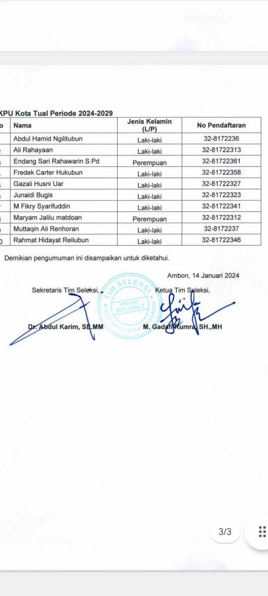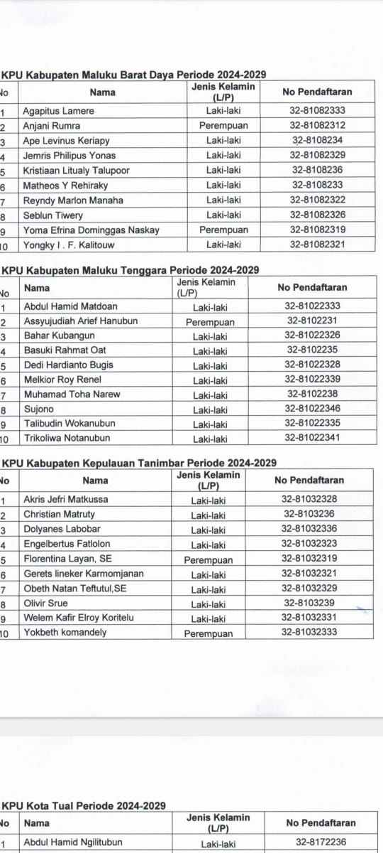 Sementara itu dari data yang diterima media ini,Tim Seleksi Calon Anggot KPU Kabupaten / Kota di Provinsi Maluku melalui pengumuman, Nomor : 26 / Timsel Kab / Kota Maluku 2 – Gel XI-PU/04/8/1/2024, tentang hasil seleksi Calon Anggota KPU Kabupaten Kepulauan Aru, Kabupaten Maluku Barat Daya, Kabupaten Maluku Tenggara, Kabupaten Kepulauan Tanimbar dan Kota Tual periode 2024 – 2029 telah menetapkan nama 10 besar berdasarkan berita acara tim seleksi.