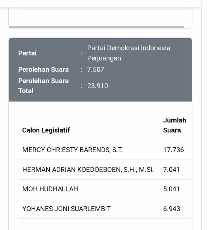 Sedangkan pada urutan ketiga srikandi PDI – Perjuangan, Mercy Cristy Barends yang juga Petahana memperoleh 17.736 suara.