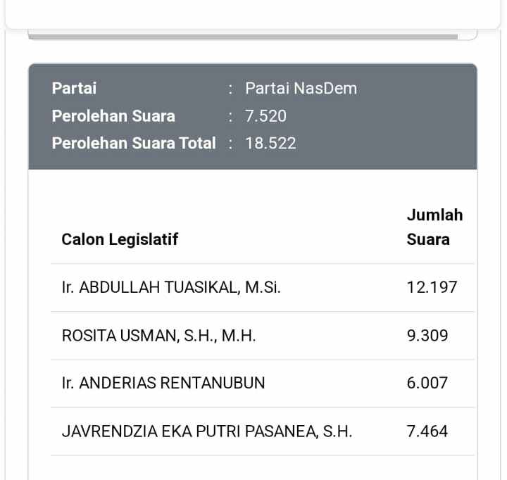 Petahana dari Partai Nasdem, Abdullah Tuasikal berada di urutan kelima perolehan suara sementara dengan perolehan 12.197 suara.