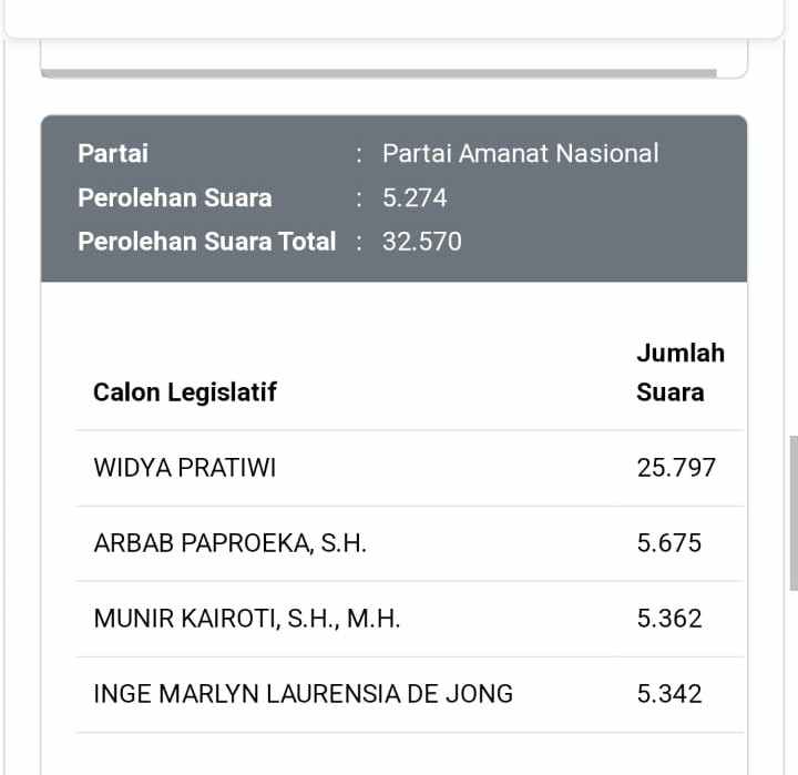 Tual News – Berdasarkan Sirekap KPU, untuk hasil Pileg DPR RI, dapil Maluku hingga sabtu ( 17 /2/2024 ) pukul 08.30 WIT caleg DPR RI asal PAN Nomor urut satu, Widya Pratiwi Murad masih memimpin peroleh suara terbanyak dengan meraih 25.797 suara.