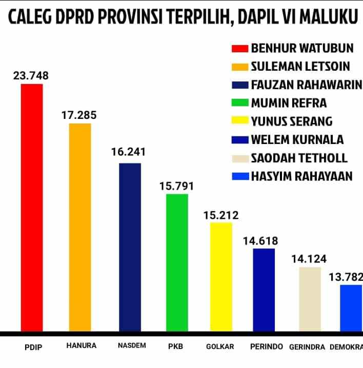 Dengan demikian untuk delapan kursi Dapil VI Provinsi Maluku pada pemilu Legislatif 2024 diisi empat pendatang baru yakni Suleiman Letsoin ( Hanura ), Fauzan Rahawarin ( Nasdem ), Welem Kurnala ( Perindo ) dan Hasyim Rahayaan, S.H dari Partai Demokrat.