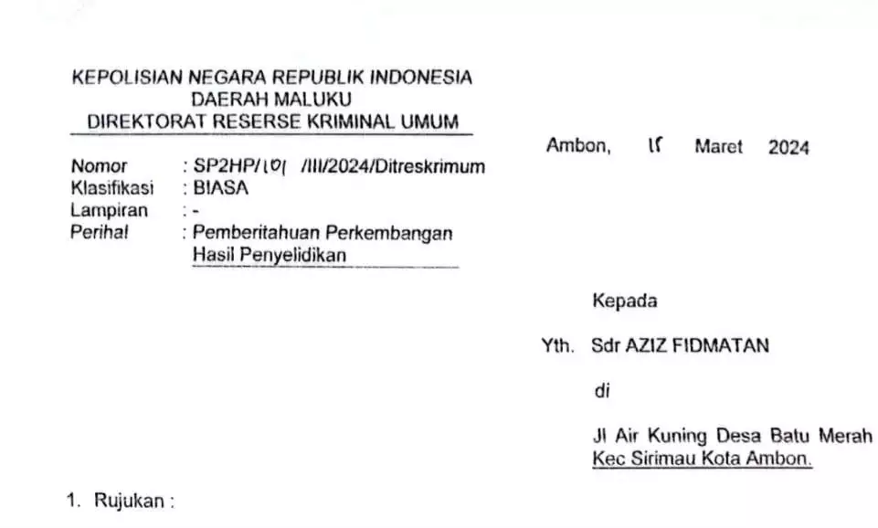 ” Dalam pemeriksaan Penyidik Polda Maluku tanggal 18 April 2024 oleh Aipda Rivaldo V.Pattinama, saya tegaskan, kalau saya merasa dirugikan atas