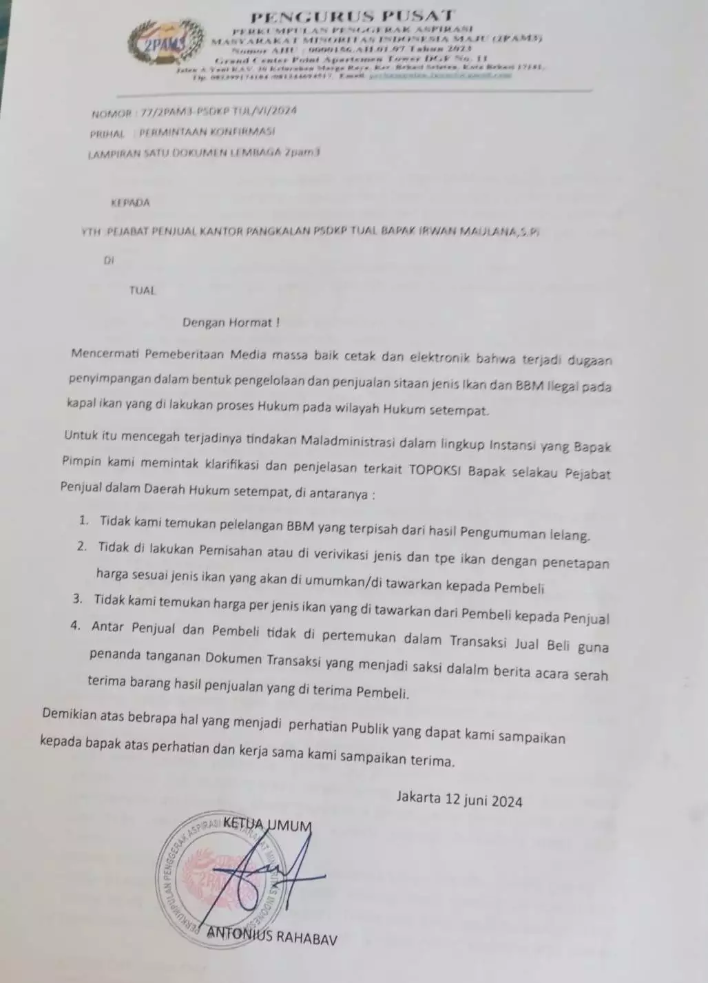 Untuk diketahui, berdasarkan data yang diperoleh media ini, Ketua Lembaga Perkumpulan Penggerak Aspirasi Masyarakat Minoritas Indonesia ( 2PAMI ), Antonius Rahabav mengirim surat laporan aduan yang ditujukan kepada Penjabat Penjual Pangkalan PSDKP Tual, ketika mencermati pemberitaan media cetak dan elektronik, terkait dugaan penyimpangan, dalam bentuk pengelolaan dan penjualan barang sitaan jenis ikan serta BBM ilegal pada kapal ikan yang dilakukan proses hukum diwilayah hukum PSDKP Kota Tual.