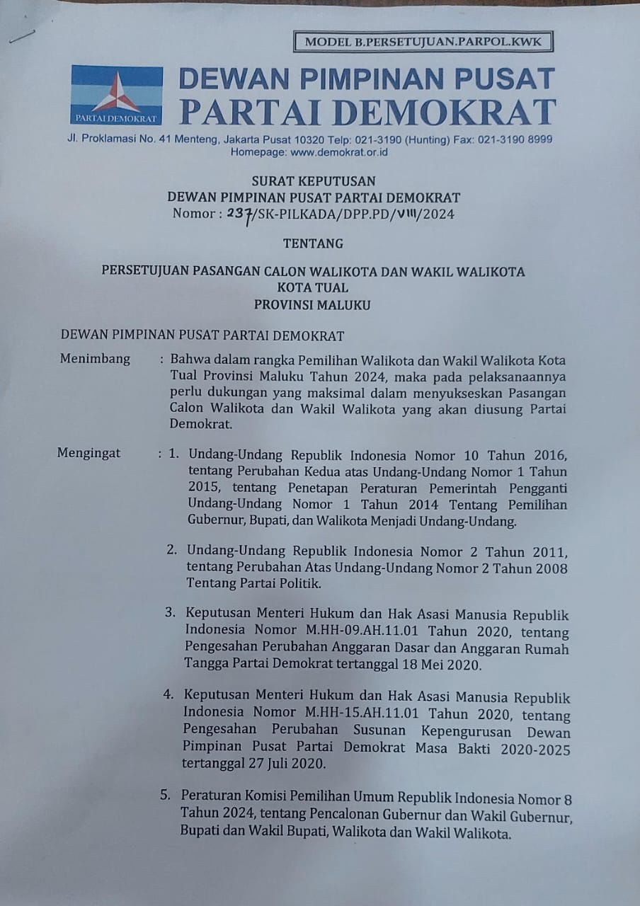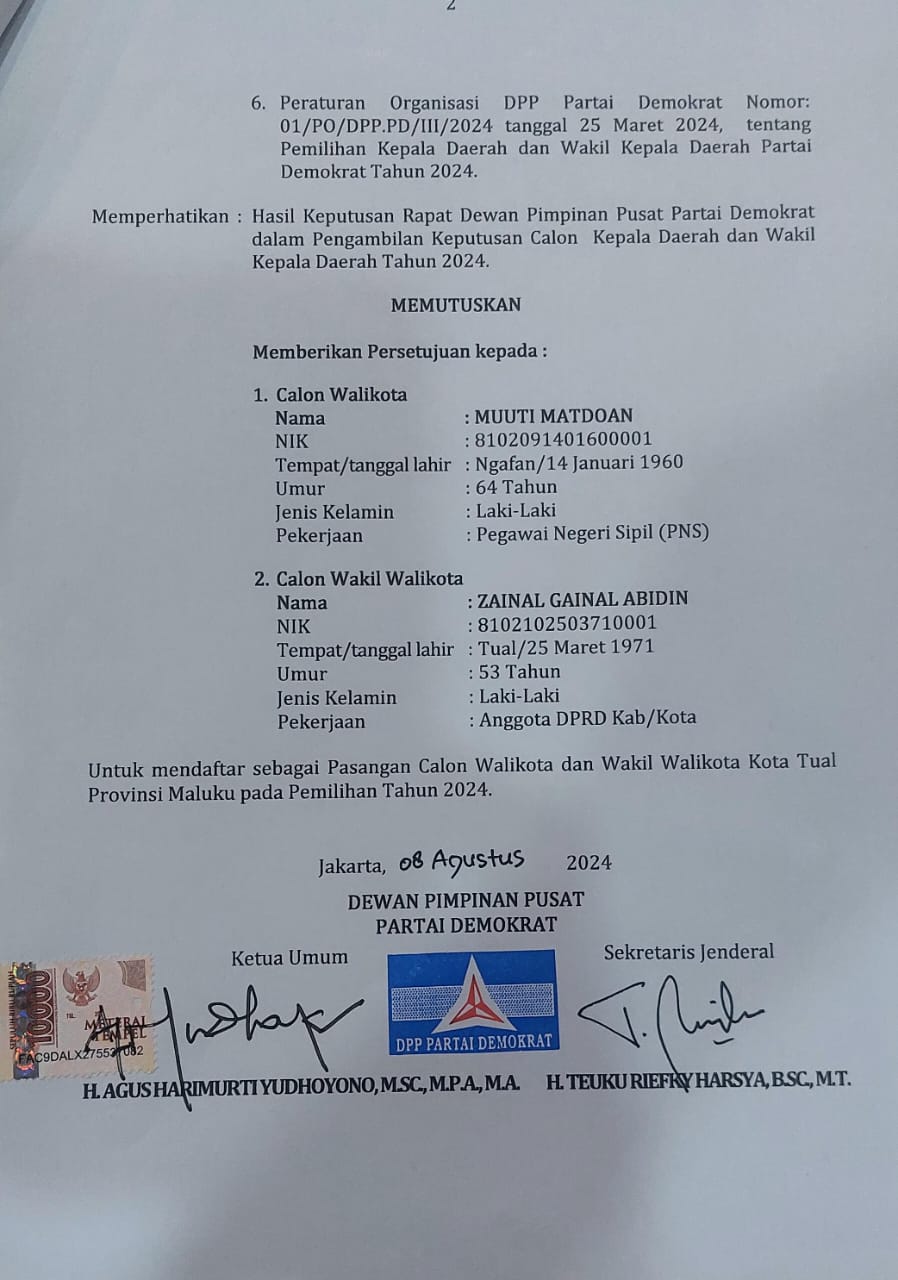Untuk diketahui DPP Partai Demokrat mengeluarkan rekomendasi Nomor: 237 / SK – Pilkada/DPP- PD/ VIII/2024 tentang persetujuan pasangan Bakal Calon Wali Kota Tual, Muuti Matdon ( MM ) dan Bakal Calon Wakil Wali Kota Tual, Zainal Gaidin Abidin atau dikenal dengan sebutan Jimal Kabalmay ( JK).