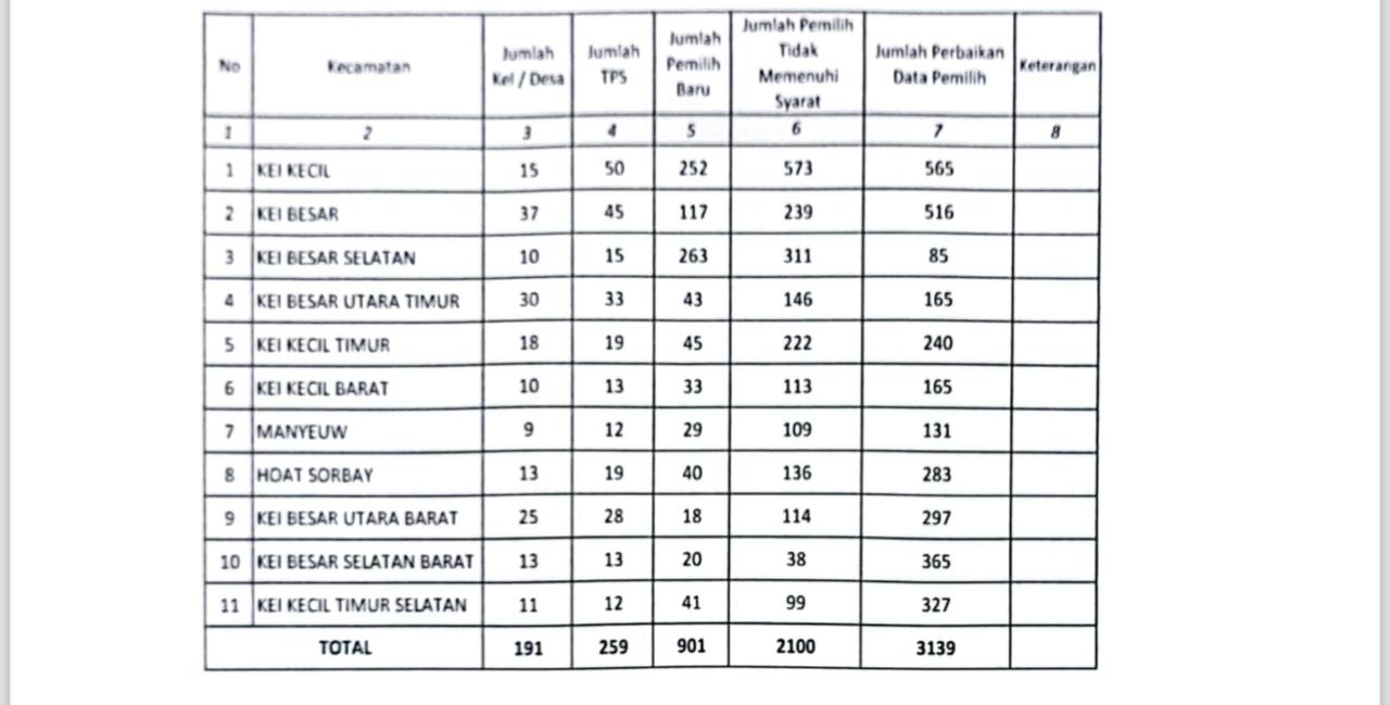 Berikut ini Hasil Rekapitulasi Pemutakhiran Terakhir DPS Kabupaten Maluku Tenggara Pilkada 2024