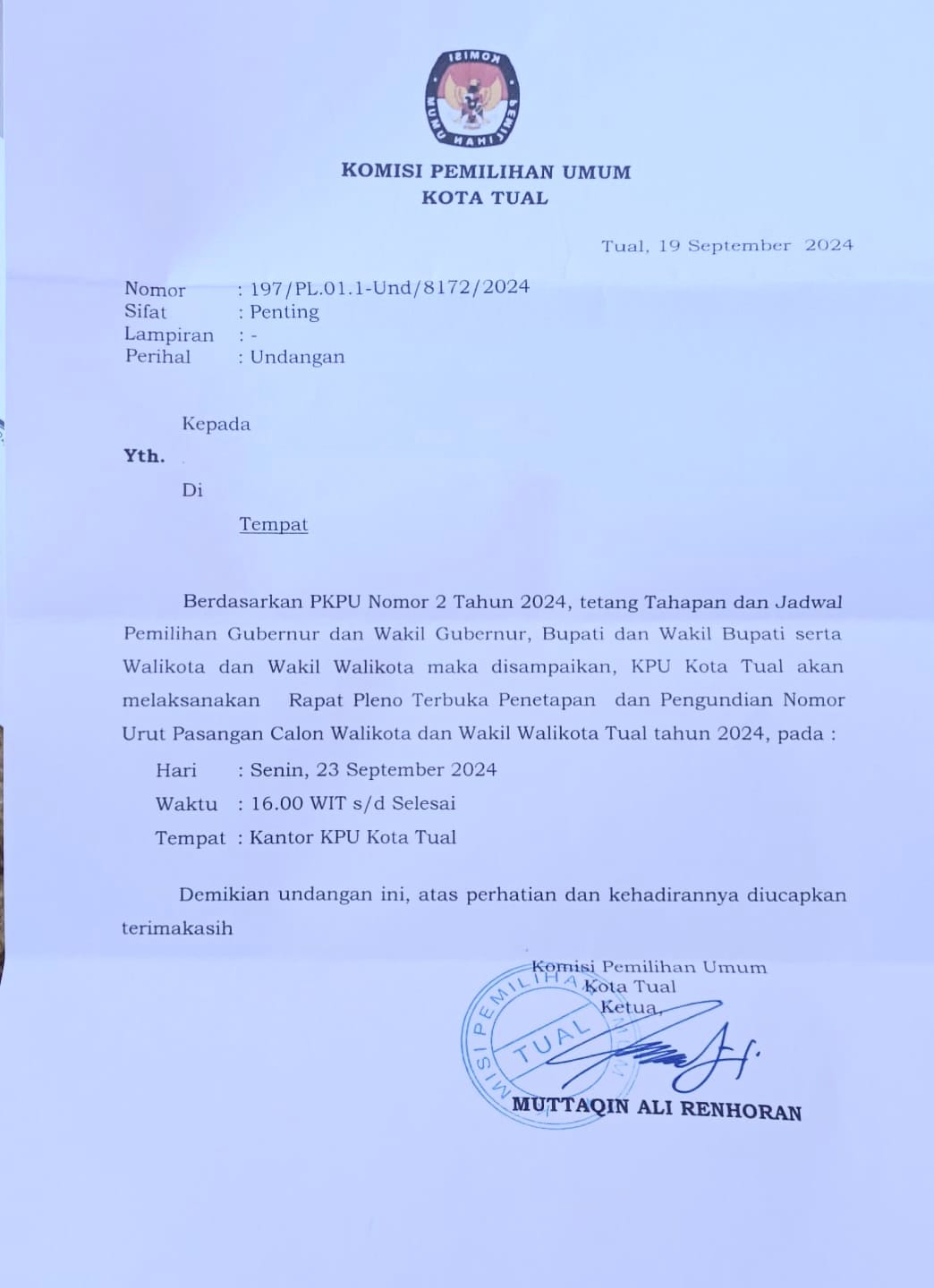 ” Pelaksanaan rapat pleno terbuka di Kantor KPU Kota Tual, Senin 23 September 2024, pukul 16.00 WIT sampai selesai, ” ungkap Ketua KPU Kota Tual dalam surat undangan yang ditandatangani.