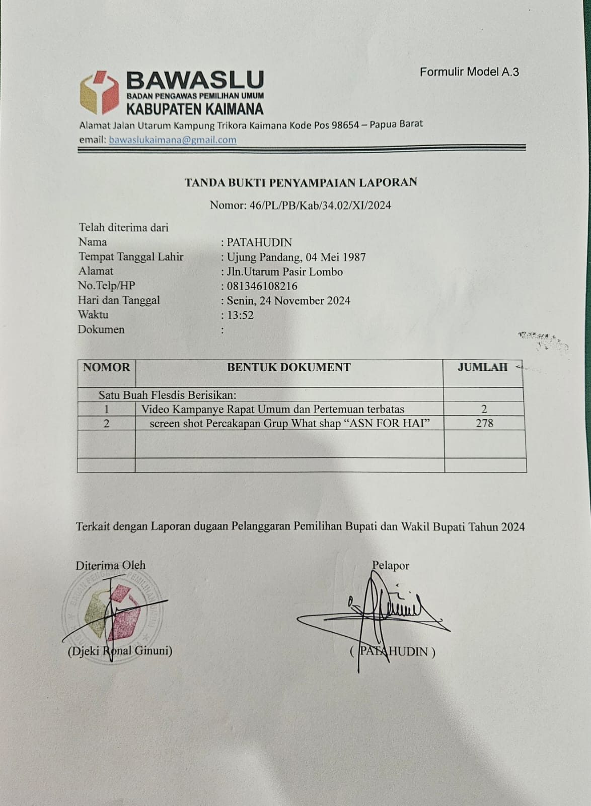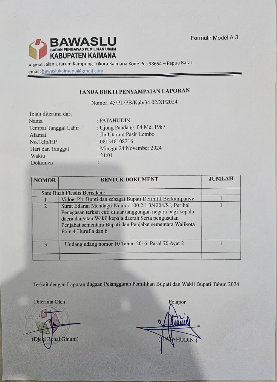 Pelapor kasus ini di Bawaslu Kaimana adalah Patahudin. Tanda bukti penyampaian laporan ini sudah diterima Bawaslu Kabupaten Kaimana, Djeki Ronald Ginuni, dengan nomor laporan : 45/PL/PB/Kab/34.02/XI/2024, hari Minggu, 24 November 2024.