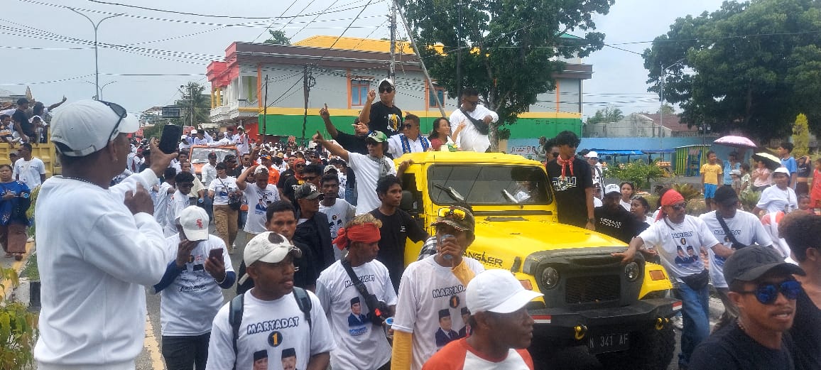 Ribuan masa pendukung paslon MARYADAT itu berkumpul dan berjalan kaki menuju Stadion Maren Langgur mengikuti kampanye rapat umum terbuka.