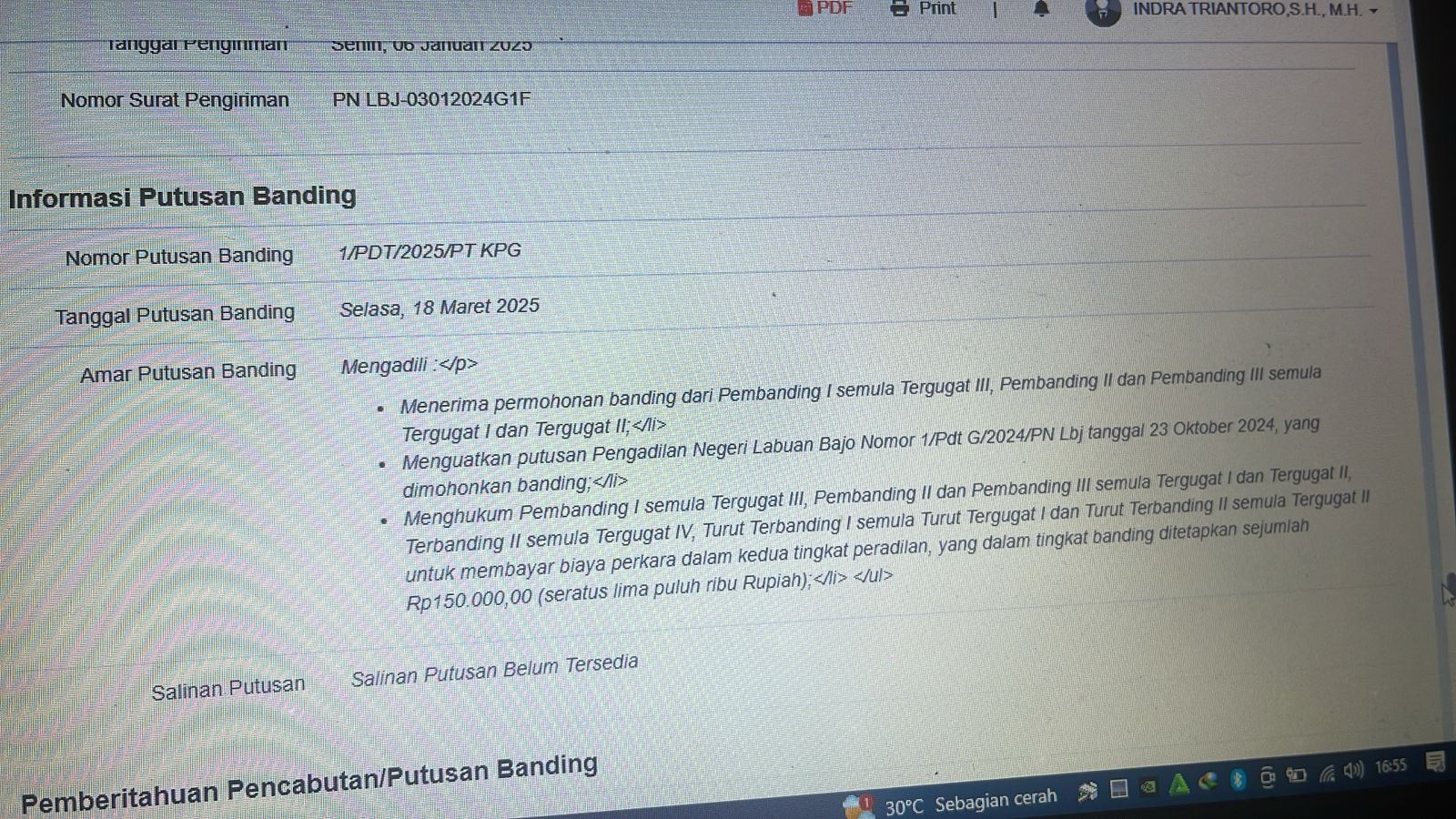 Tim kuasa hukum ahli waris almarhum Ibrahim Hanta, yang diketuai Dr (c) Indra Triantoro, S.H., M.H., Kamis (20/3/2025) mengonfirmasi, mereka telah menerima putusan banding secara online melalui e-court.