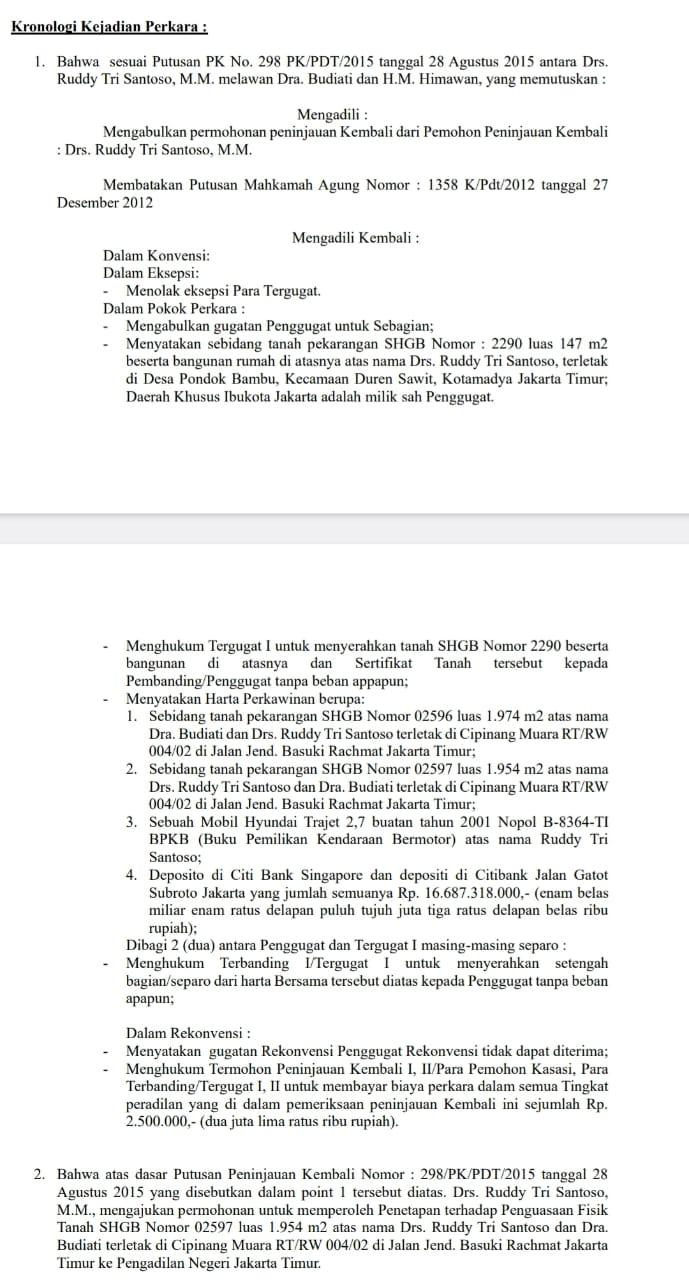 “Terpaksa dalam waktu dekat kami akan melakukan upaya hukum dan melaporkan kurator AN dan pengacara AD ke kepolisian. Sebab hal ini bertentangan dengan keputusan Mahkamah Agung (MA) terkait sengketa tanah dan rumah antara kami (red-Ruddy Tri Santoso) melawan Dra. Budiati dan HM. Himawan,” pungkasnya.