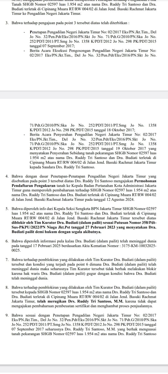 “Kami sudah berkonsultasi ke BPN Jakarta Timur, Kamis (15/5/2025) ke BPN Jakarta Timur dan benar ada surat dari kurator AN tersebut. Terduga kurator AN diangkat dan ditunjuk pengacara AD ada upaya kongkalikong dan kepentingan lain,” ucapnya