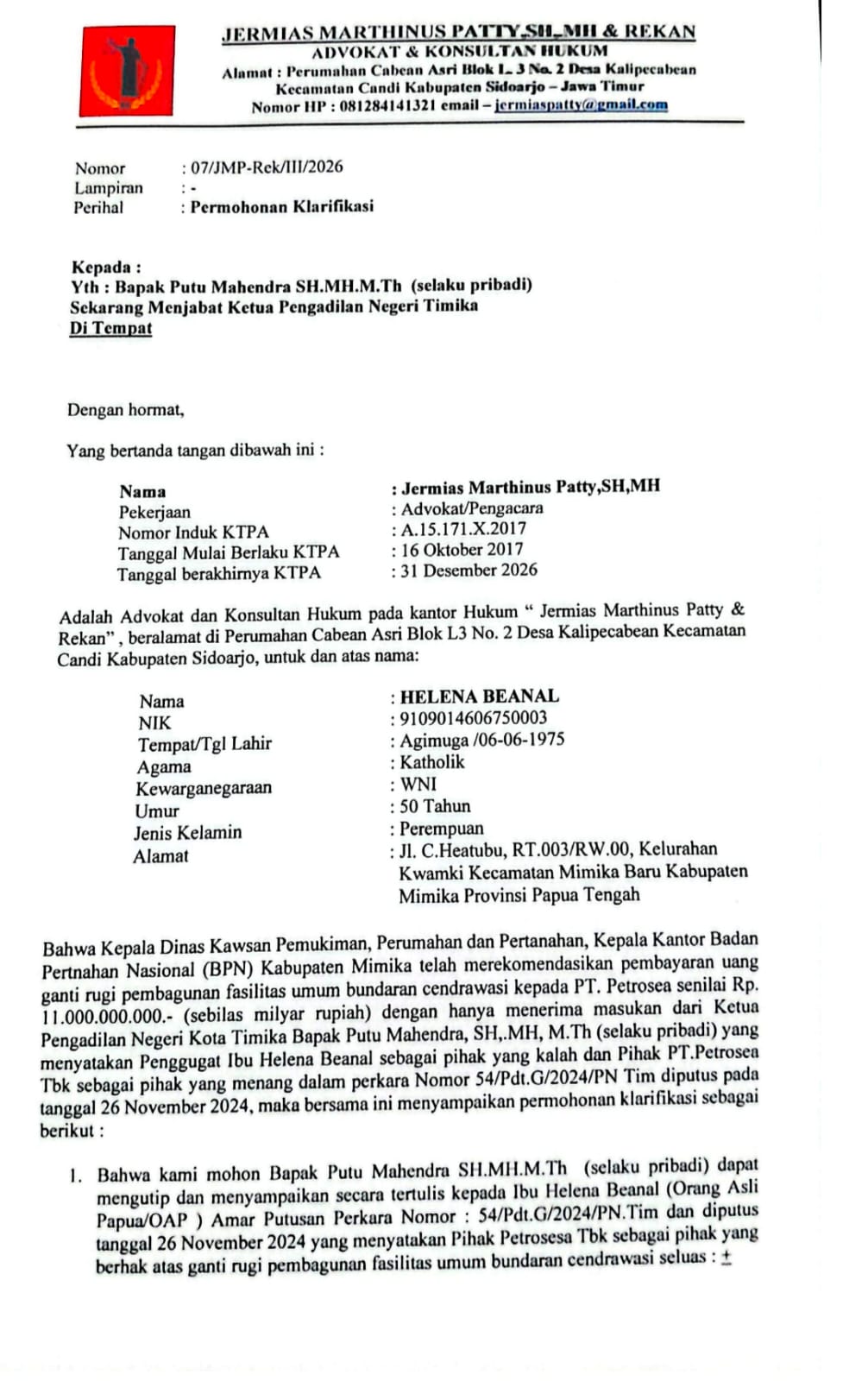 Kuasa hukum Helena Beanal, Jermias M. Patty, menyoroti isi Surat Bupati Mimika Nomor 900.1.1.4/0797/2023 tentang Penetapan Pagu Anggaran Perubahan OPD TA 2025.