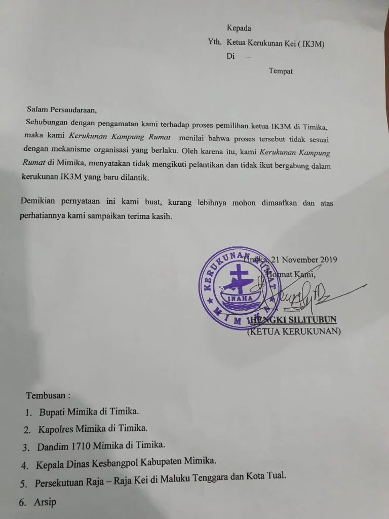 Surat pernyataan penolakan ini tembusanya juga di sampaika kepada Bupati dan Wabup Mimika, Bupati Maluku Tenggara, Walikota Tual, Kapolres Mimika, Kejari Mimika, Ketua Pengadilan, Rat Ohoilim Tahit bersama Kepala Kantor Kesbangpol Kabupaten Mimika.