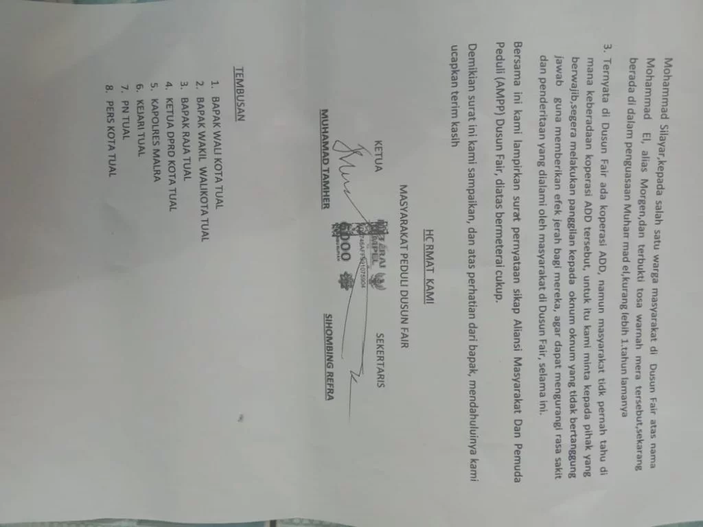 Tamher dalam laporanya itu menyesalkan sikap Kepala Dusun Fair, Muhamad Silayar yang membuat Koperasi ADD, tanpa diketahui masyarakat Dusun Fair.